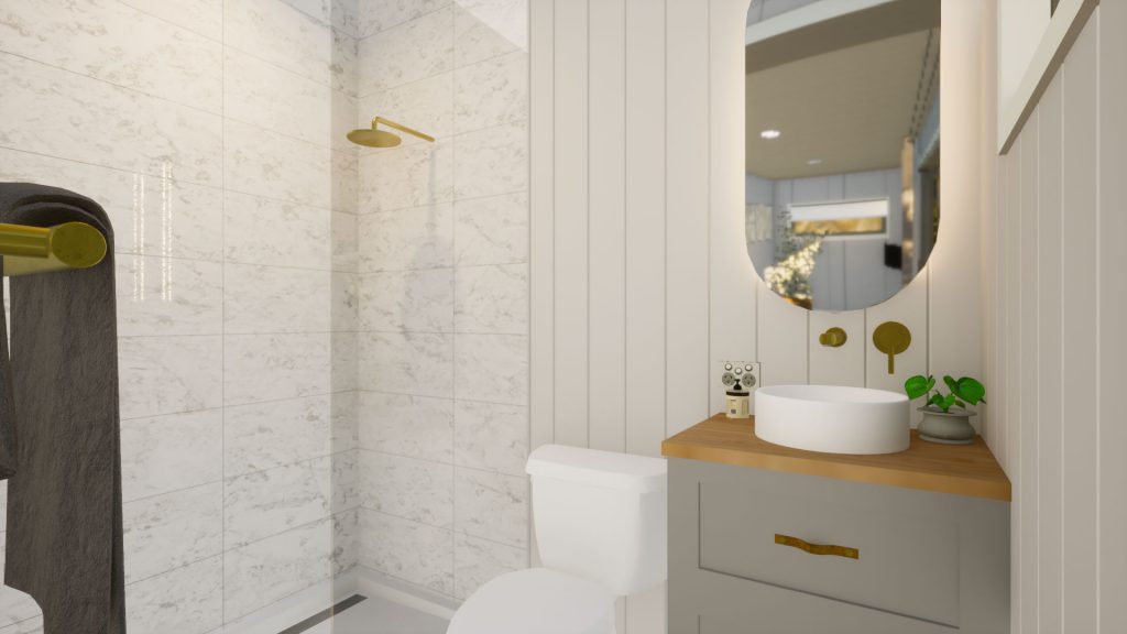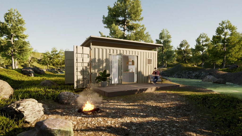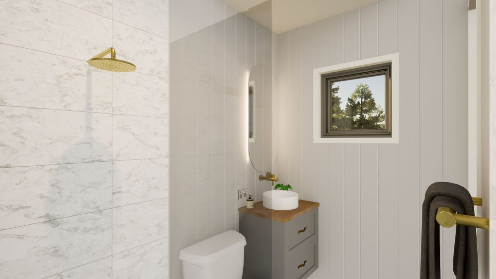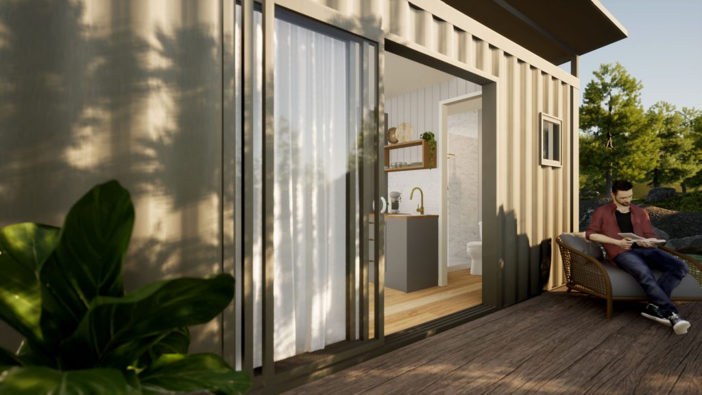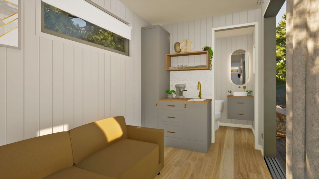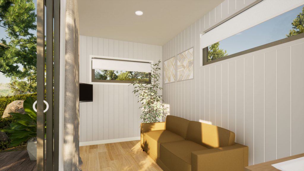 The Cosy Retreat is perfect for visiting friends and relatives, as a teenage retreat or granny flat. Its stylish, clean line exterior is unobtrusive and sits easily next to any main property dwelling. Entry is via glass sliding doors which open on to the kitchenette, which features cabinetry, drawers, wall shelving and a sink. The bathroom is compact, stylish and functional with toilet, shower and vanity unit with washbasin. There’s space for a double bed or lounge suite and the double glazed windows and sliding glass entry doors, provide beautiful natural light. This clever interior floor plan maximises the space and functionality and you can customise with colour options for the fit-out in regard to benchtops, tiles and paint.